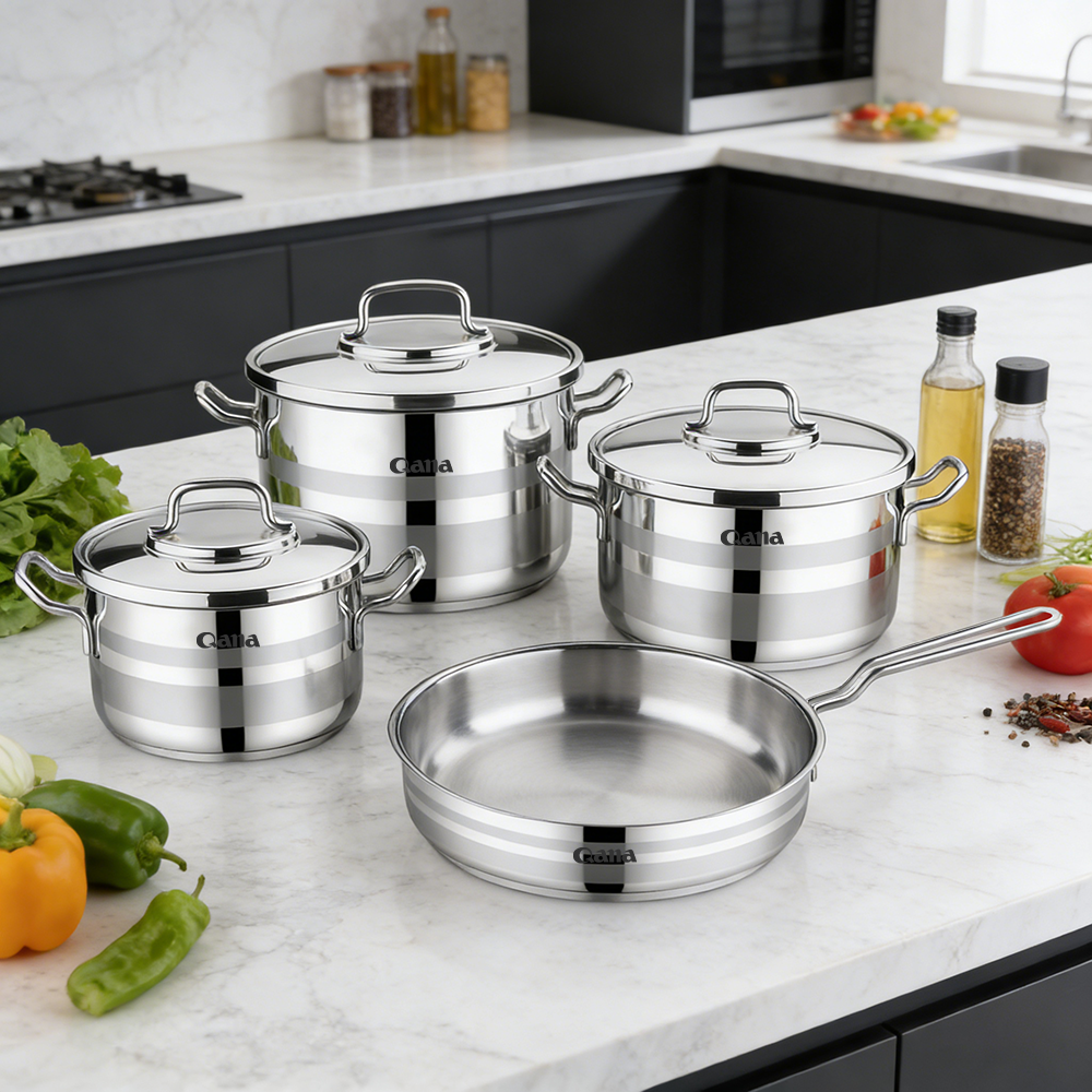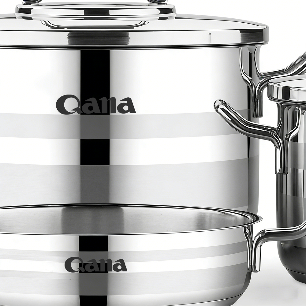 - Anyfish Stainless Steel Cookware 16PC Cookware Set Includes Saucepans Steamer and Lids【A DREAM SET】 Stainless steel cookware includes 2.3QT & 3.2QT saucepans with cover, 7.7” steamer insert, 8.9” open skillet, 10” skillet with cover, 4QT saute pan with cover,8QT stockpot with cover, stainless steel turner, slotted turner, ladle and slotted spoon.