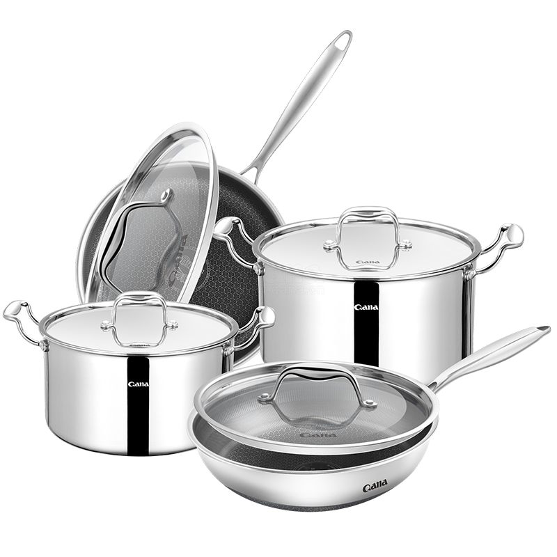 - Anyfish Stainless Steel Cookware 16PC Cookware Set Includes Saucepans Steamer and Lids【A DREAM SET】 Stainless steel cookware includes 2.3QT & 3.2QT saucepans with cover, 7.7” steamer insert, 8.9” open skillet, 10” skillet with cover, 4QT saute pan with cover,8QT stockpot with cover, stainless steel turner, slotted turner, ladle and slotted spoon.