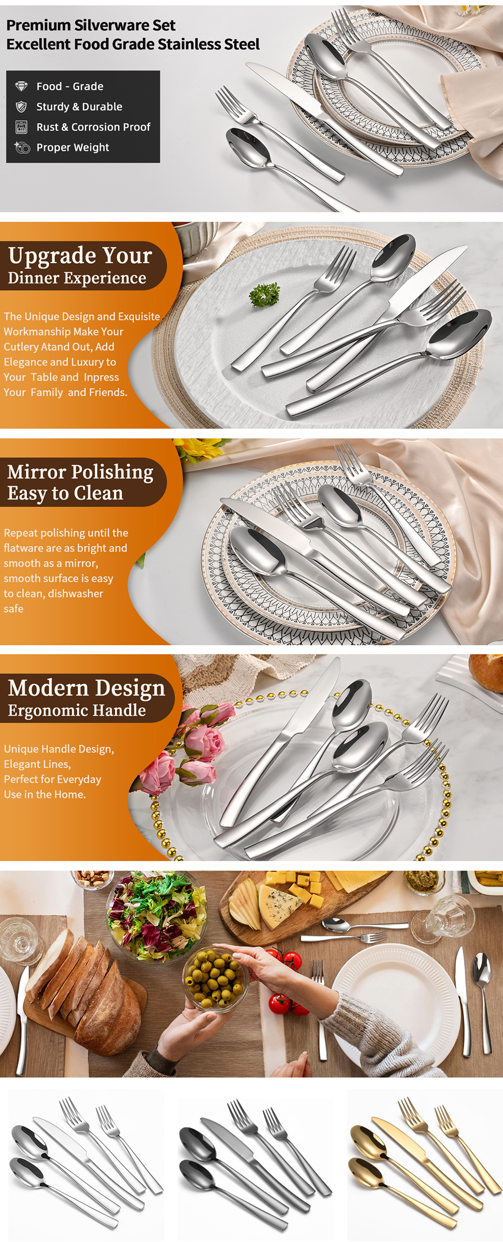 Suitable for different occasions, whether it is daily use like family dinners or formal occasions like wedding, banquet, this flatware set is an ideal choice.