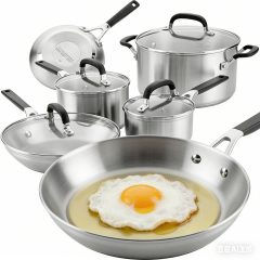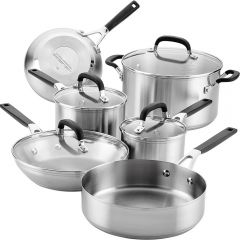 Ignite kitchen creativity and experience rich flavor with the KitchenAid Stainless Steel 10-Piece Cookware Set. Crafted from durable stainless steel with a layer of heat-conductive aluminum in the base, these pots and pans are designed to heat quickly and evenly to grill, boil, and simmer with ease. Saucepans and stockpot feature etched measuring marks to add measured ingredients. Stainless steel handles have been finished with silicone grips for a cooler handle while cooking, when compared to traditional stainless steel handles, while tempered glass lids seal in heat and flavor. Pots and pans are dishwasher safe for quick, easy cleanup and oven safe to 400°F (350°F with lids) for making a wide range of delicious recipes.